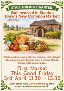 The New Common Market comes to Stanton Drew 11:30 – 1:30pm + Add to Google Calendar + iCal / Outlook export Date Apr 03 2026 Expired! Time 11:30 am - 1:30 pm Category Community Event Public Event Share this event